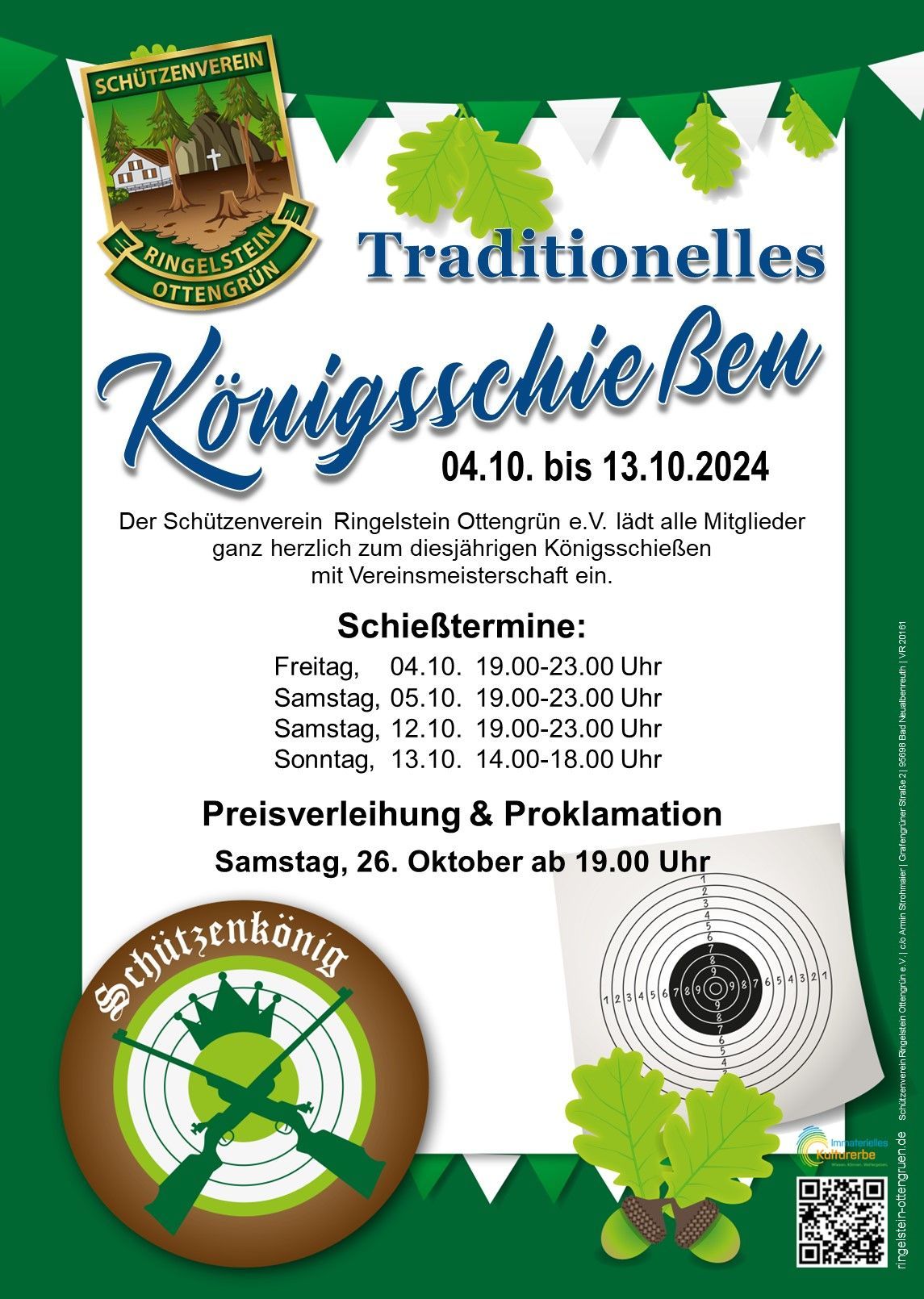 Der Schützenverein Ringelstein Ottengrün e.V. lädt alle Mitglieder ganz herzlich zum diesjährigen Königsschießen mit Vereinsmeisterschaft ein. Schießtermine (zusammen mit dem Kirchweihschießen): Freitag, 04.10., 19.00-23.00 Uhr Samstag, 05.10., 19.00-23.00 Uhr Samstag, 12.10. 19.00-23.00 Uhr Sonntag, 13.10., 14.00-18.00 Uhr Preisverleihung: Samstag, 26. Oktober ab 19 Uhr