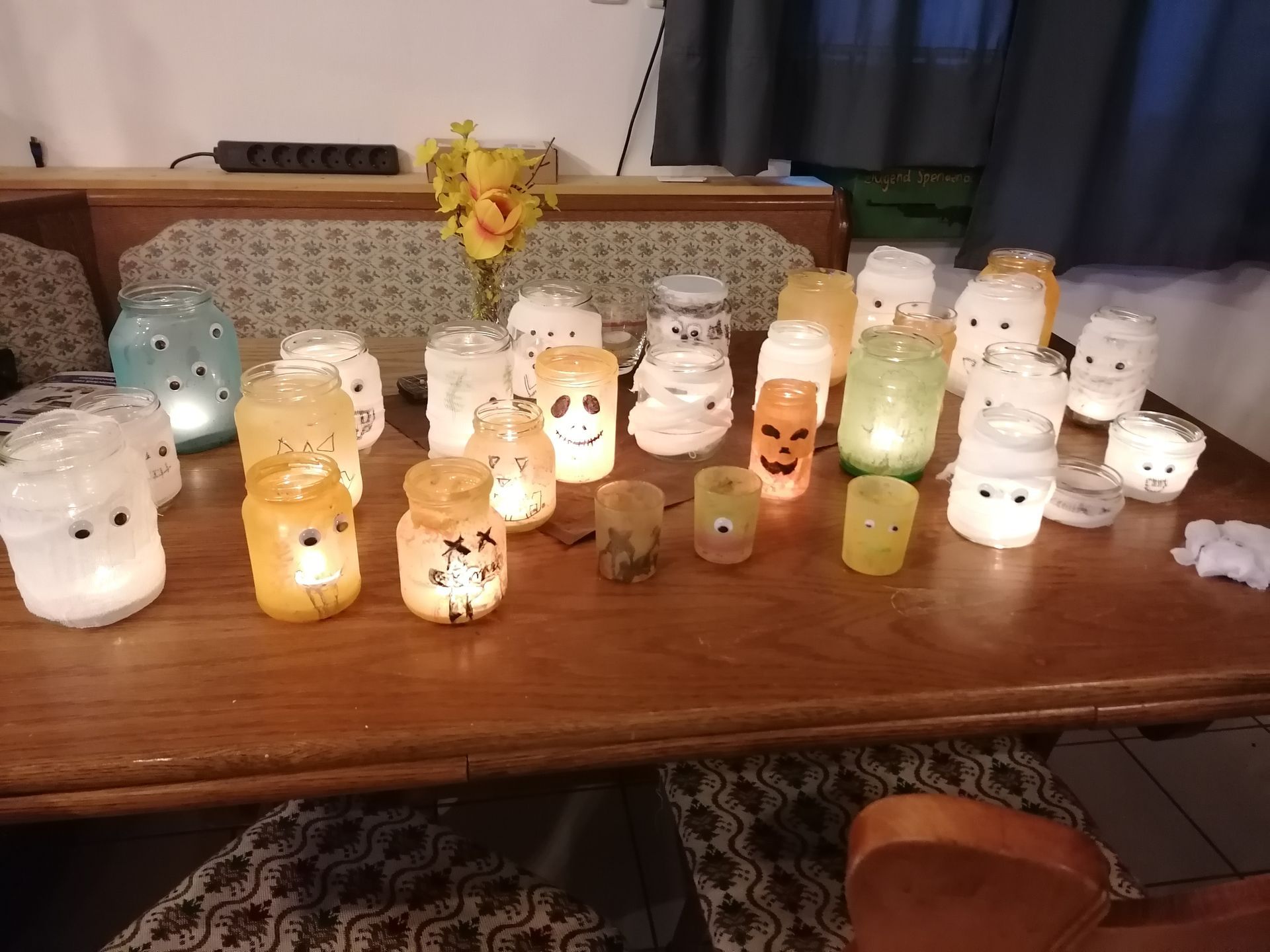 Ergebnis waren schaurig schöne Windlichter aus alten Gurkengläsern, Verbandsmaterial und viel Farbe!
