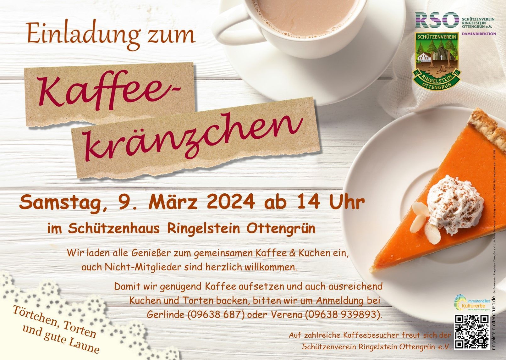 Herzliche Einladung zum Ringelsteiner Kaffeekränzchen                                                                                                                         Wir laden alle Genießer zum gemeinsamen Kaffee & Kuchen                                                                  am Samstag, 15. März 2025 ab 14  Uhr                                                       ins Schützenhaus ein, auch Nicht-Mitglieder sind herzlich willkommen.                                                                                                            Damit wir genügend Kaffee aufsetzen und auch ausreichend Kuchen und Torten backen, bitten wir um Anmeldung bei Gerlinde (09638 687) oder Verena (09638 939893).                                                                                                            Auf zahlreiche Kaffeebesucher freut sich der Schützenverein Ringelstein Ottengrün e.V.
